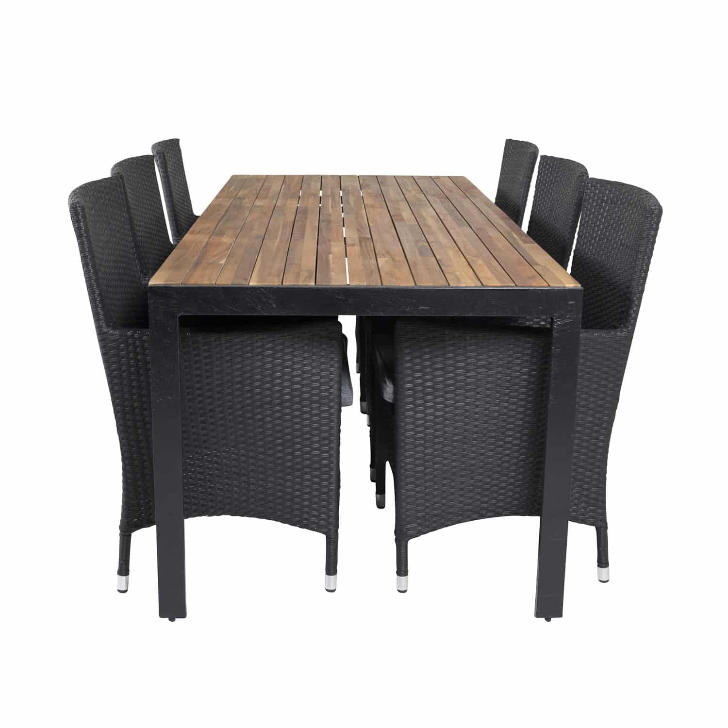 Dette fine havesæt er fra Venture Design. Bois havebordet er lavet af naturfarvet akacietræÂ og sort aluminium. Der medfølger 6 Malin havestole med armlæn og grå hynder til bordet. Stolene er lavet af sort flet. Her får du et nordisk og moderne designe