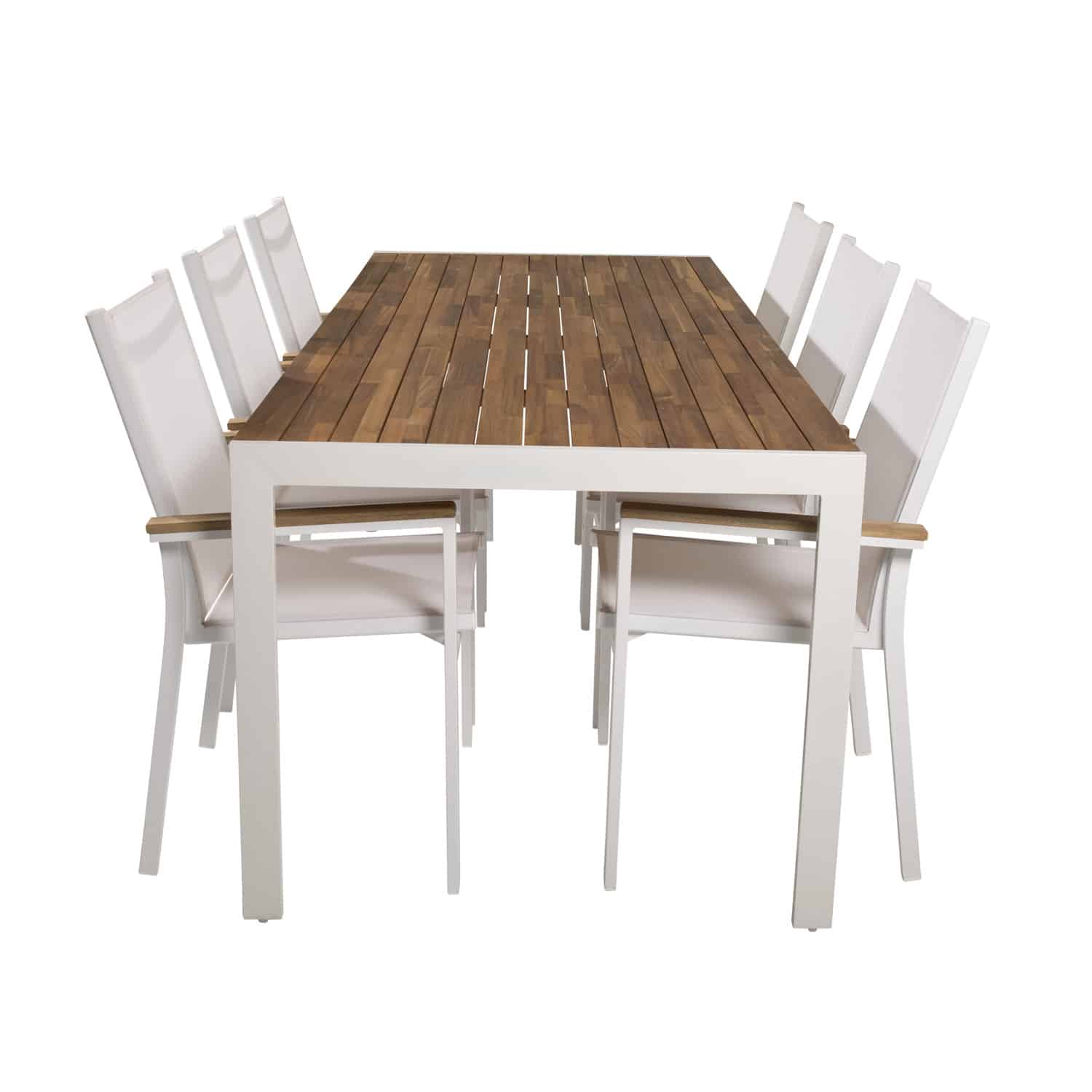 Dette fine havesæt er fra Venture Design. Bois havebordet er lavet af naturfarvet akacietræ og hvid aluminium. Der medfølger 6 Texas havestole med armlæn med teaktræÂ til bordet. Stolene er lavet af hvid textilene og hvid aluminium og de kan stables,