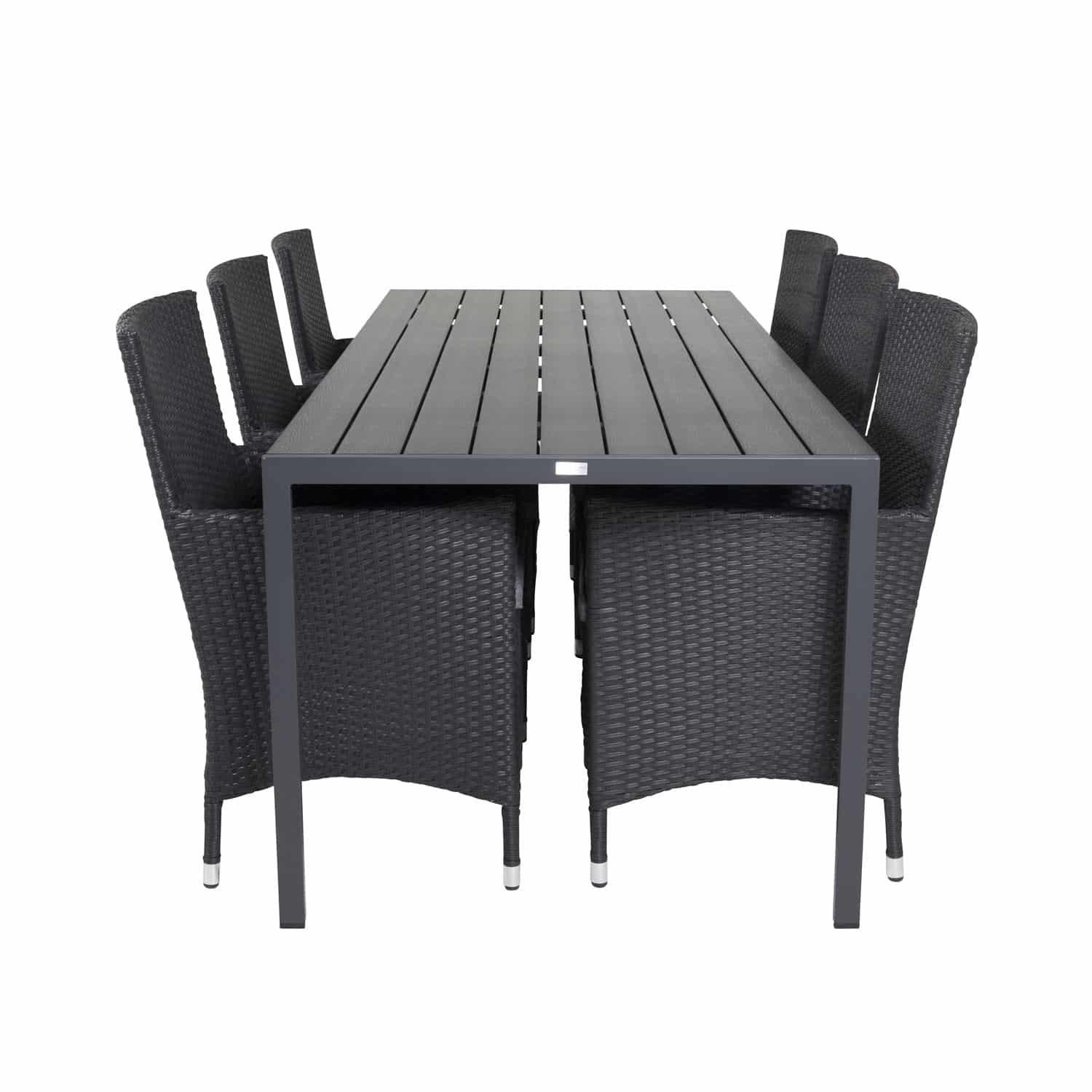 Dette fine havesæt er fra Venture Design. Break havebordet er lavet af sort aintwood og sort aluminium. Der medfølger 6 Malin havestole med armlæn og grå hynder til bordet. Stolene er lavet af sort flet. Her får du et nordisk og moderne designet havesæ