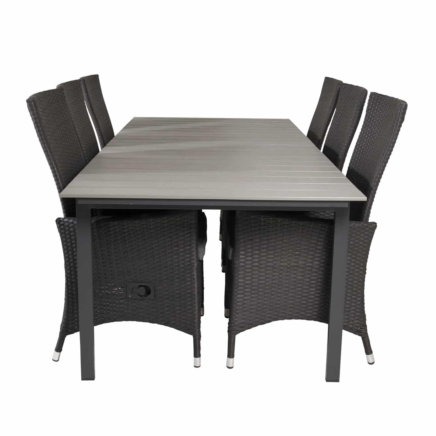 Dette fine havesæt er fra Venture Design. Levels havebordet er lavet af grå aintwood og sort aluminium. Det er designet med butterflybordplade, så bordet kan forlænges, hvis du har brug for det. Der medfølger 6 Padova recliner havestole med armlæn og