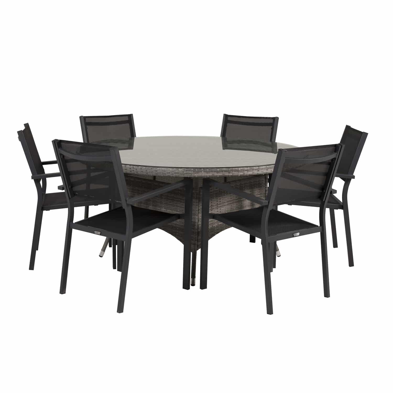 VENTURE DESIGN havesæt m. Volta bord (Ø150) og 6 Copacabana stole m. armlæn – sort textil/grå rattan